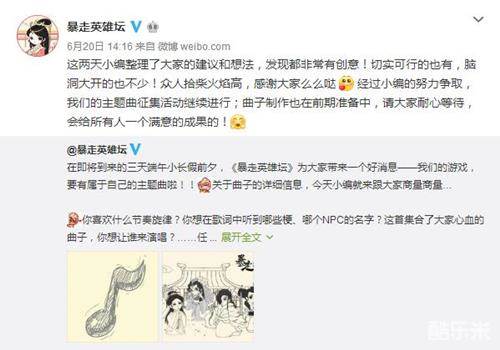 十分契合《暴走英雄坛》所传达的“初心”思想,这款游戏的玩家群体质量也是非常之高。自游戏主题曲征集活动伊始,不论是评论区、话题区,还是玩家群、论坛版块,众多投稿纷至沓来,玩家热情极高。并且,稿件不仅数量上十分可观,质量也是“巧夺天工”:大家列出了许多符合游戏特色的同类型歌曲作为参考,还推荐了演唱风格或搞笑、或古风的优秀歌者,给官方奉上了一众优秀建议。