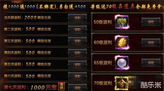 在开服3天内参加投资计划,花费1000元宝,投资后立马返还1000元宝和2000绑定元宝,之后每天获得500绑定元宝,到达一定等级,还可以领取等级奖励。第七天,还可以领取1000元宝。