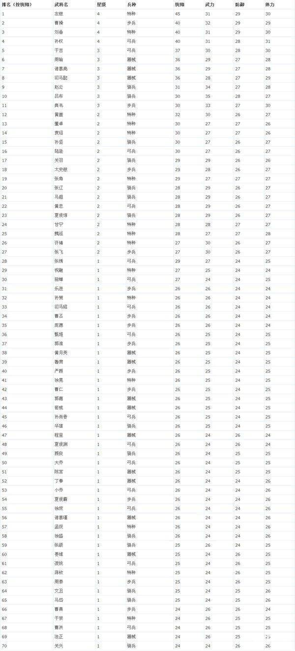 这次表格的武将全部都是传说级别的人物哈,不过按照星级的不同,分别四个级别,分别是1星武将,2星武将,3星武将和4星武将。一般来说,高星的介意的统帅、武力、防御和体力有等都比低星的高,个别除外。同时,每个星级的武将都有一个最厉害的,称为“精”字武将。友友们可在游戏中看到有些武将上面有一个“精”字。这四个加“精”的武将,一个是第一名的左慈,另外三个分别是于吉,黄盖和张绣。