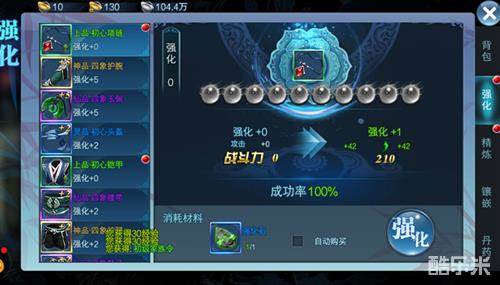 装备可强化时会显示可强化红点,玩家可通过强化界面消耗材料或者自动购买(需消耗元宝)对装备进行强化。