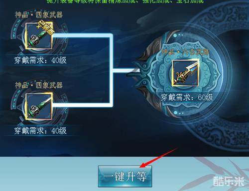 游戏中,玩家可使用装备升等功能,将已穿戴的橙色装备、红色装备,通过升等材料将已装备的装备变为更高穿戴等级的同品质装备。