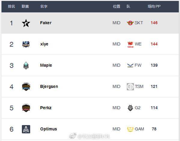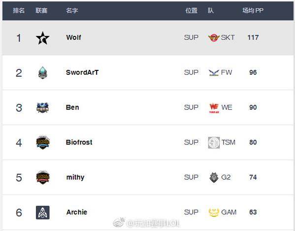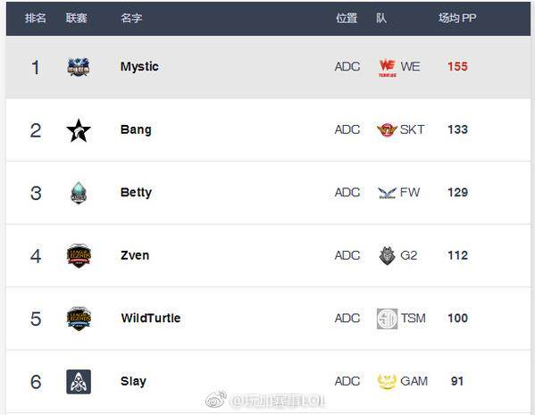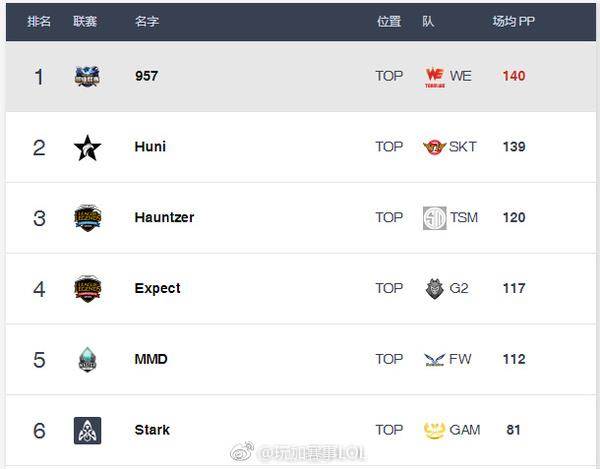 Best.gg更新了各位置排名,凭借WE今天战胜SKT,957也在PP值上反超Huni一分来到榜首。中单位xiye与Faker只差两分,Mystic保持住了第一的位置,今天Ben只登场一次,排名下降一位。