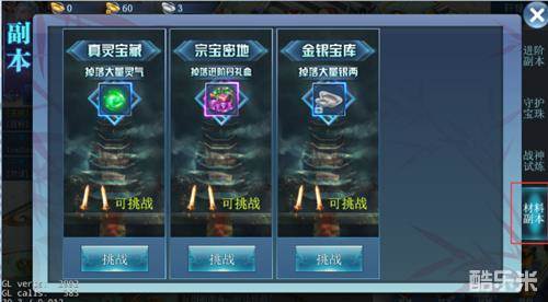 材料副本包括:灵气、进阶丹、银两副本;每个副本依据难度分为不同关卡,挑战关卡需达到一定角色等级;