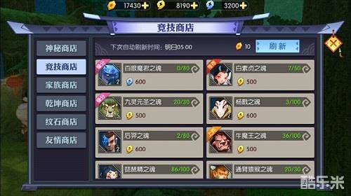 商店列表:神秘商店、竞技商店、家族商店、乾坤商店、友情商店
