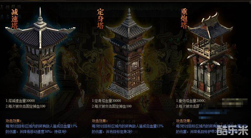 今天给大家说下守护塔有几种,第一是减速塔,可以降低范围内的移动速度50%。定身塔,每5秒对范围内目标出发定身一次,每次2秒。重炮塔可以降低目标20%的护甲。