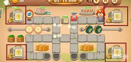 1、图中四个红色方框处,隐藏着几个蘑菇塔,蘑菇塔可以减缓怪物行进的速度,所以这是必拿的。所以,可以在如图所示位置,建两个多重箭,在杀怪的间隙,打右下角的宝箱。