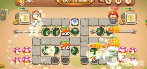 2、等打下右下方宝箱后,升级下最靠近道路的两个蘑菇。以此为基础,前期基本安稳了。仿照这个打法,打其他三个红色方框。