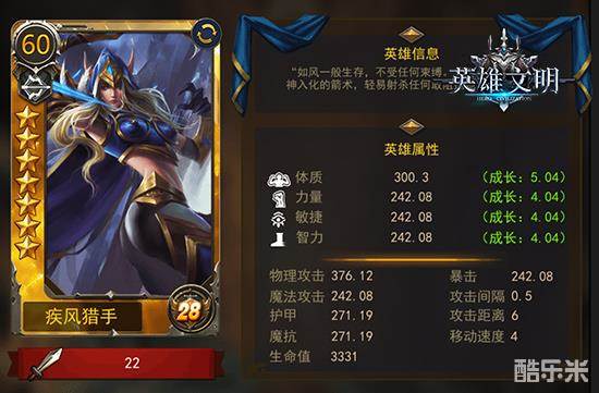 疾风猎手,一听这名字就能猜到她是敏捷型英雄。该类英雄有点脆皮,但是攻击力较强,偏向于远程攻击,最大的特点是攻击间隔时间最短,即在相同时间内,她能比其他属性的英雄打出更多次的输出。