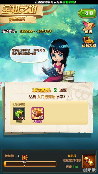 但是也不要慌,罗宾答题时间是没有限制的,所以大家可以去查资料,但是馆长考核每道题只有25秒的时间!所以想要馆长考核想要得高分,对于大部分玩家来说其实是考验手速的活动,只需要一边手机看题目,一边电脑问度娘,网速够快25秒足够了!参与馆长考核获得的金币和大骨头远多于罗宾考核,而且每题可以积累10点智慧值!可以更轻松领取进度宝箱,毕竟是原著粉丝高考题,这收益,我看行。