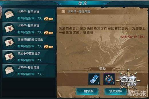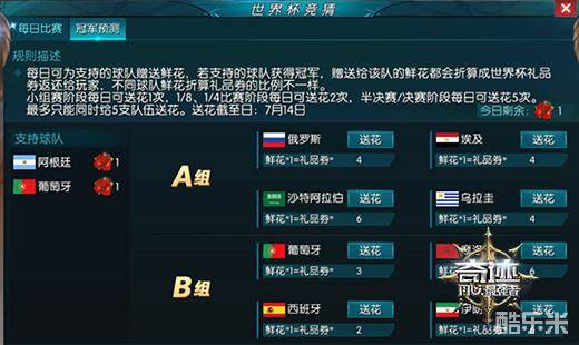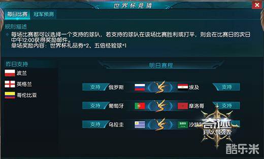 《奇迹:最强者》世界杯竞猜如果我们在每日竞猜环节中有幸猜中比赛结果,那么我们将收获到一份福利,将有幸与胜者一起分享胜利的喜悦!