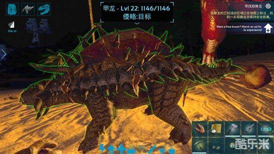 中期的话,可以去驯服一头甲龙,甲龙采集矿石的效率很高,往往一尾巴就是几十块打火石,两三块石头就能一组了(甲龙移动速度慢,用迂回战术毒箭毒晕即可驯服,主要分布北方和火山附近)。
