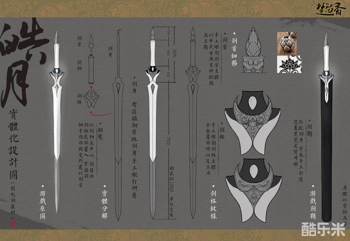 在《楚留香》手游原画师思越的设计图纸中可以看到,皓月由剑首、剑柄、剑格与剑身共同组装而成,总长1060毫米,剑首与剑格均是手工雕刻,以中式古典吉祥纹样为主题,并嵌之以玉石金属,整体焕发着刚柔相济的和美气质,符合一代剑客楚遗风的侠骨柔情魅力。