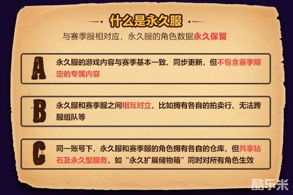 与赛季服相对应,永久服的角色数据将会被永久保留。永久服与赛季服在运行时犹如两条平行线,但又有一定的继承关系。永久服的游戏内容也与赛季基本一致、同步更新,但不包含赛季限定的专属内容;而且永久服和赛季服之间相互对立,比如拥有各自的拍卖行、无法跨服组队等。