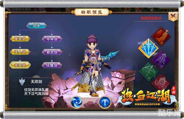 天人剑,四转后则为无双剑,取其天下无双,唯有一剑之意。邪派邪灵剑则化为狂魔剑,狂魔一出天下皆惊。在转职技能方面,两个阵营的剑侠均有不俗的表现,不论是被动还是主动技能,要么提高伤害要么增加控场能力。