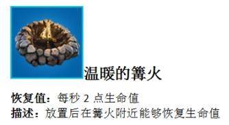 篝火是一个小道具,能够恢复生命值,是一个在多排时很有用的装备,篝火不可以直接放在地上,需要先建一个横板,在一定范围内(差不多就一个横板的大小,超出这个横板就没办法回血了)的队友和自己在每秒内共同回复2滴生命值,持续25秒,很多时候没有包就只能打绷带,但绷带又只能恢复到75,这时候篝火就显得很关键了,建一个掩体,然后放上篝火,和队友一起回回血,聊聊天,再接着玩。