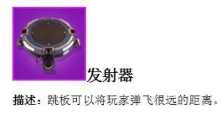 发射器也被称为跳板,玩法真的很多,而且能区分新手与老手,老手使用跳板可以打出各种各样的花式操作,可以狙死敌人之后直接跳板飞过去捡东西,也可以直接在很高的斜坡上方发射器,直接弹起来开伞飞走,这能让玩家逆天改命,遇到一些致命的天谴圈时,可以通过这个道具来把自己送进去,如果有多个跳板,还可以来回蹦,非常有意思,是一个趣味和实用性都很高的道具。