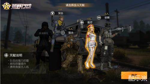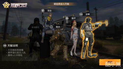 玩家可以在“协同作战”中选择狙击、突击、侦察、医疗四种战斗天赋,每种天赋各具特点,携带不同的初始装备,并具有不同的能力加成。