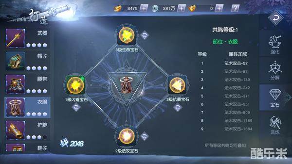 日常玩法中获得的宝石可以镶嵌在装备栏位上,每个装备栏可以镶嵌4个宝石,宝石分各种不同的属性,对应的装备栏位需要镶嵌固定的属性宝石。宝石可以合成,4个栏位中的宝石均达到等级时就可以激活共鸣属性。