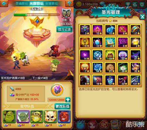 其次就是同样可以增加勇者们战力的圣光祭坛,不同于灵魂祭坛,圣光祭坛是针对圣光援护效果进行增幅,并且也是按照倍数进行增幅。圣光本身就是提高宝物属性加成,而光辉祭坛就是使圣光的加成最大化,从而提升宝物属性,跟灵魂祭坛一样,直接增加勇者攻击力,提升闯关力度。