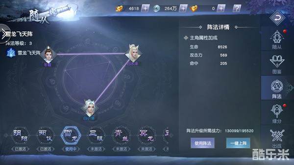 ■随从阵法达到阵法激活条件可以激活不同的随从阵法,包含随从数量、境界和少量的银币