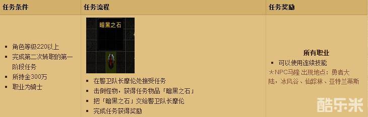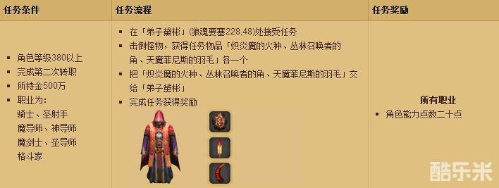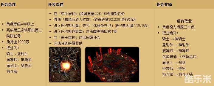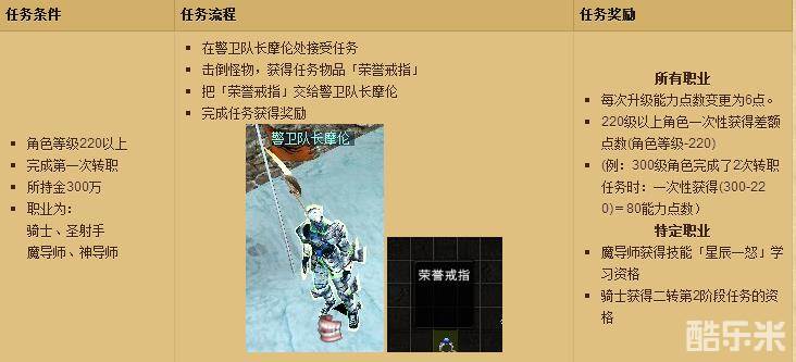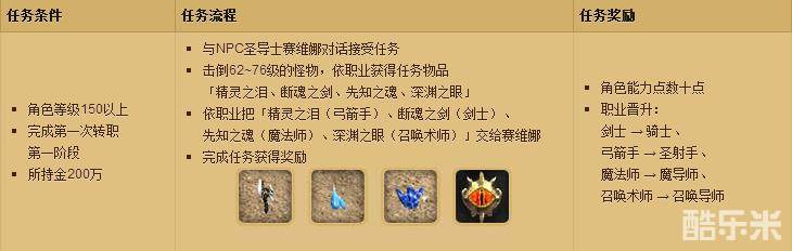 奇迹MU中,转职任务是400以后继续升级的前提条件,也可以在220级以后为战士,弓箭手,法师和召唤带来每级多1点的收益,属于必做任务。有些玩家因为不熟悉系统(好多是玩手游全民奇迹或者大天使之剑找过来的吧),又接受游戏内一些似懂非懂的玩家误导,导致任务耽误很久没做完,这里小编就给大家详细说明一下,希望对大家有所帮助。