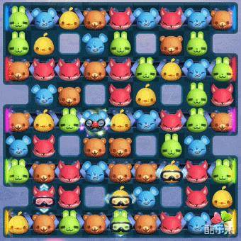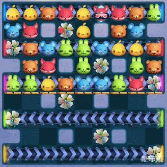 1、棋盘的中间有一行栅栏,将棋盘分成了上下两个区域,下方区域没有棋子存在,也就无法给下方区域的四叶花和五叶花染色。不过这行栅栏均是可消栅栏,且只需攻击一次即可消除。所以我们开局直接在可消栅栏旁边,寻找消除机会,消除一个可消栅栏让棋子下落,扩大我们的匹配空间。