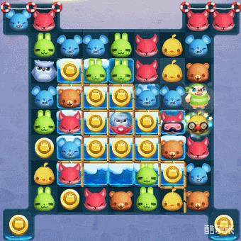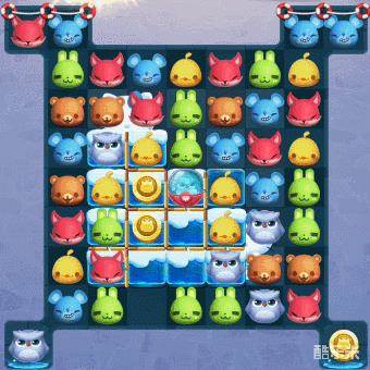 1、kitty均藏在棋盘中的冰块下方,只要消除冰块,就能收集到被冰块覆盖着的kitty了。本关的冰块非常集中,都在棋盘的中间区域,消除起来较为方便。但是冰块区域充满了大量金币和可消栅栏,所以我们必须先消除它们,才能更容易的消除冰块,来寻找和收集kitty。