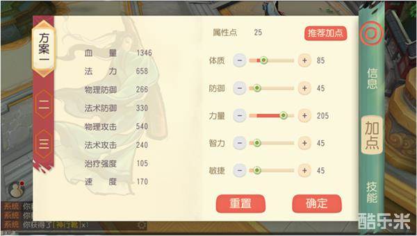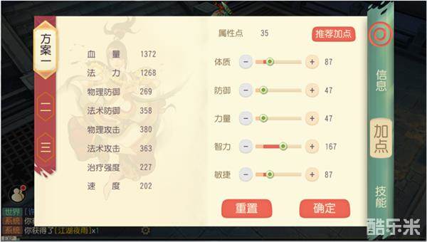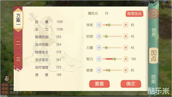 月宫的推荐加点是4智1体,比较适合练级。如果装备上的血量已经足够,可以选择暴力的5智力加点。月宫天生速度不快,所以很少点敏捷,PK中也可以选择4智1防来针对物理门派。