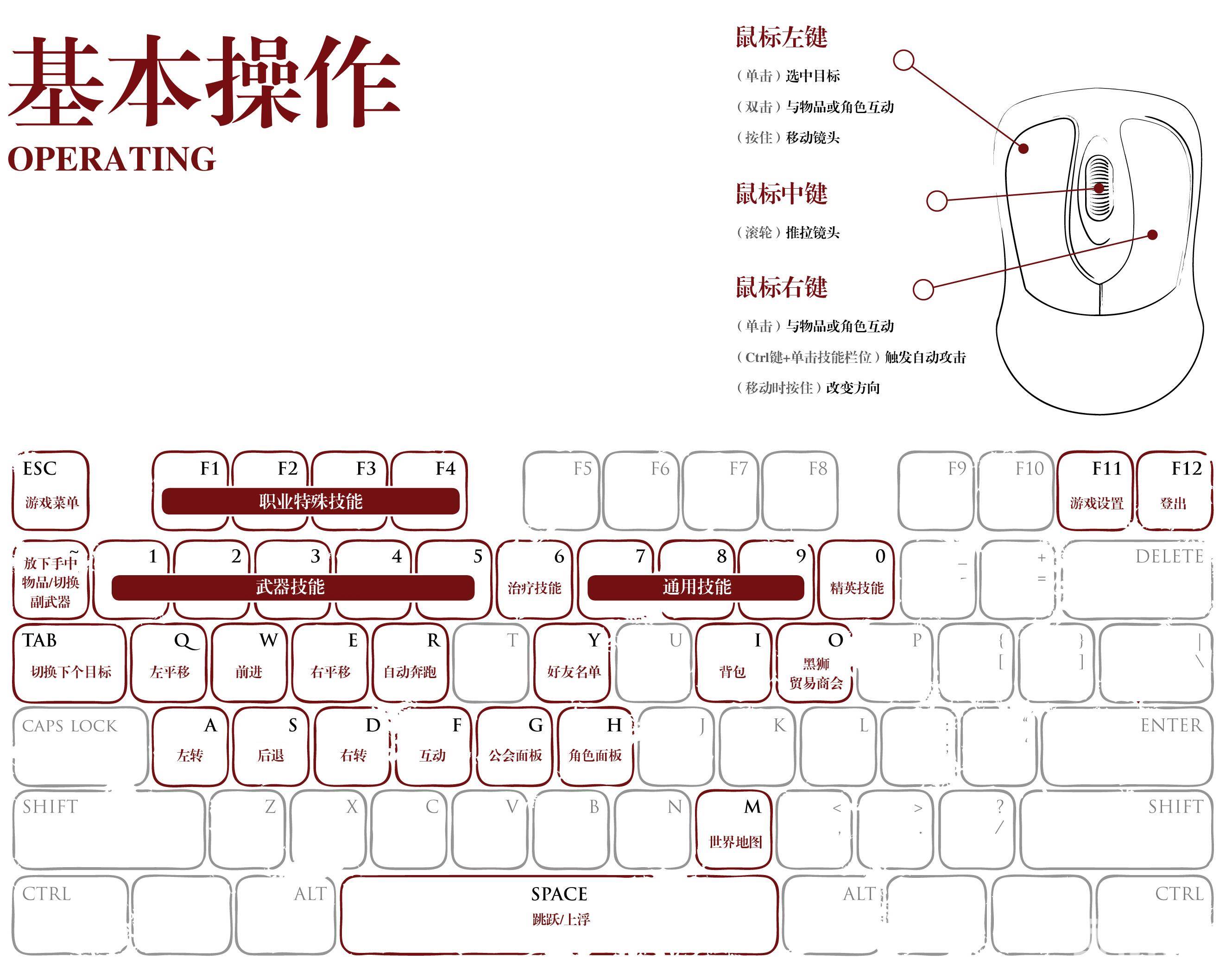 在游戏中,玩家的基本行动由键盘左侧的按键,配合鼠标进行控制。当然您可以在之后的冒险过程中,通过设置来修改自己的快捷键位置。