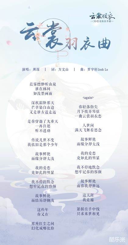 《云裳羽衣》手游主题曲《云裳羽衣曲》今日QQ音乐同步首发!由金牌作词人方文山填词,内地著名男歌手周深演唱,深情款款的嗓音配上凄美诗意的歌词,半半已经沦陷在单曲循环中不能自拔啦!