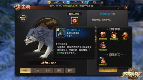 各位主公在看到《刀锋无双2》里有这么多奇异坐骑时,是不是心痒难耐却苦于不知如何获取呢?坐骑获取一共有多种方式,如“雷鸣魔狼”就可以通过5种方式进行碎片获取,包括登录奖励、帮派城战、赛马、每日签到和快捷购买,而其他坐骑碎片则可以通过策马活动、坐骑投资、悬赏兑换等活动进行获取!需要注意的是,每一种坐骑根据珍稀度的不同,坐骑名字颜色会有所区分,从低到高分别为白色、绿色、蓝色、紫色、橙色。珍稀度越高,坐骑合成所需碎片越多,获取难度也会更高!各位主公可以通过坐骑页面查看自己心爱坐骑的获取方式,只要坐骑碎片达到指定数量,即可合成坐骑!
