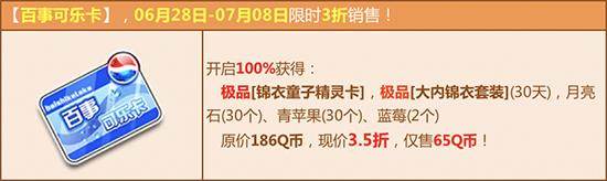夏日极限特惠!6月28日-7月8日,开启【百事可乐卡】可以100%获得:极品【锦衣童子精灵卡】,极品【大内锦衣套装】(30天),月亮石(30个)、青苹果(30个)、蓝莓(2个),原价186Q币,现价3.5折,仅售65Q币!千万不能错过哦!