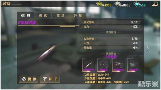 不同的套装有不同的效果,套装的数量也决定装备部件的属性。另外可以对装备各部件的强化、改造以及升星。强化增强部件的基本属性值,改造除了增加基本属性值外,还随机增加其他属性值。这些都影响到战车的属性。