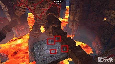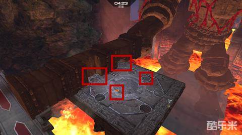 然后巨石像拿出右手的柱子,柱子标的红框是有空隙的位置但第一个可以看出来有空虚但不是一个洞所以那里要注意看,不然会死掉,靠手那边的红框是安全位置,那是一个完全空心的洞需要站在平台上标的点,第一个没空隙的点位是不能站的,但我标了红框是需要玩家们注意不能一只呆在这个点不然就凉了。