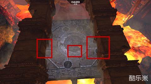 最后就是它的双柱合并了,这里俩边柱子上标的红框是有空隙的地方需要站在平台的中间位置就可以盲躲,平台上标的红框就是安全的位置,站在那里打石像上的红血管就可以站着输出,这里他会连续释放俩次双柱合并,站在同一个位置即可,缇娜下来之后技能就开始重复和刚开始介绍的技能一样的,这里也是需要大家慢慢熟悉缇娜的技能就可以轻松打丛林魅影这张地图。