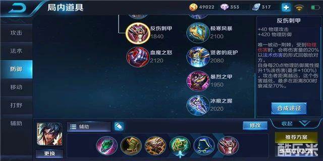 反伤刺甲提供物攻和大量物防,被动受到物理伤害时,将回敬法术伤害,这也可以配合项羽二技能被动效果增加最大生命值。