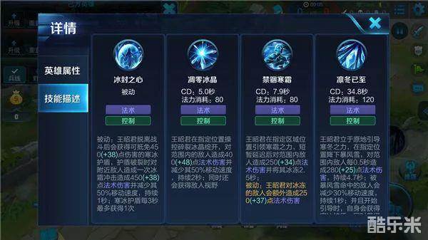 被动-冰封之心:王昭君脱离战斗之后会获得一层抵免伤害的护盾,护盾破裂时会对周围敌人造成法术伤害与减速效果,护盾有数秒的冷却时间。