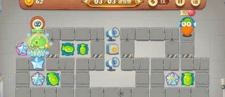 3.指引结束在怪物轨道的第一格左右两边都放上瓶子炮台,另外记得在瓶子旁边也放个冰冻星,基本上就可以加速等他胜利了。