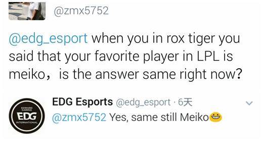 Q1:当你在rox tiger的时候你说你最喜欢LPL的选手是meiko,现在的答案是一样吗?