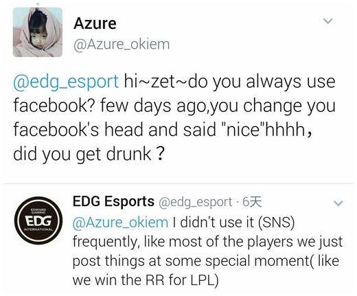Zet:我不经常使用它。就像其他选手一样,我只是在特定的时间会发布动态(比如我们在比赛中取得胜利