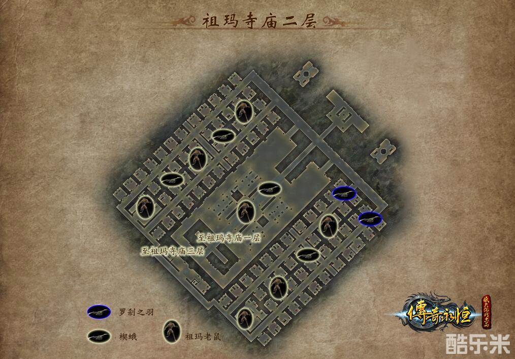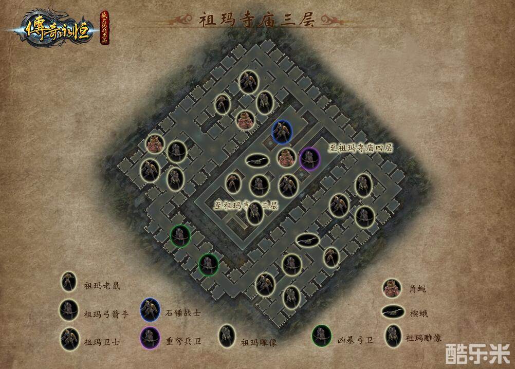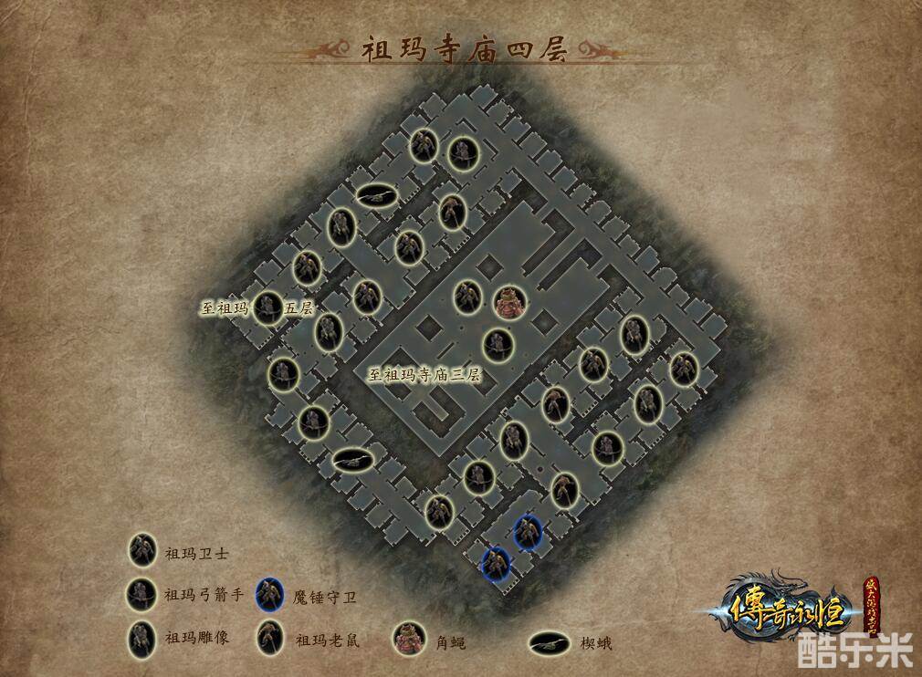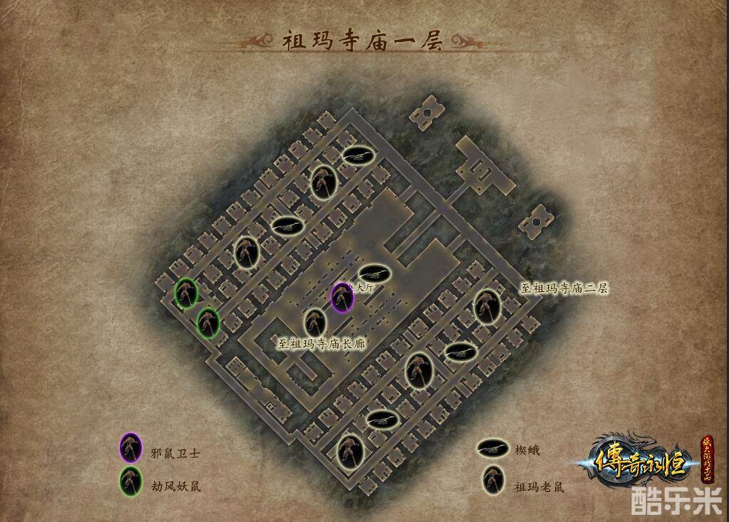 相传祖玛寺庙原是关押犯人的地方,故而,在祖玛寺庙一层至四层,每一层都有许多单独的小隔间,有的隔间里甚至还保留有当年行刑所用的刑具。在这阴暗干燥的沙漠地下,埋伏着数不清的恶心怪物,有老一辈冒险者熟知的祖玛老鼠、楔蛾、角蝇、大锤,也有在漫长岁月里变异的邪鼠卫士、劫风妖鼠、罗刹之羽等……