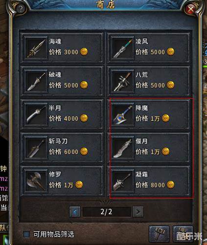 首先,一路直奔武器店(比奇盟重都有),点击漂亮的商人MM,选择一把合适你当前等级的武器。介于开服两周多,大部分玩家都和小编一样20多级,那么建议大家购买第二页的降魔、偃月或凝霜。