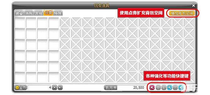 道具窗口内分别设有有装备、消耗、设置、其他和特殊5个子窗口。每个子窗口可放置相应数量的物品,当您放置不下物品时您可以选择将物品存储至游戏的仓库内。或是在游戏商城内用点券来扩充相应的窗口数量,以便放置更多的物品。