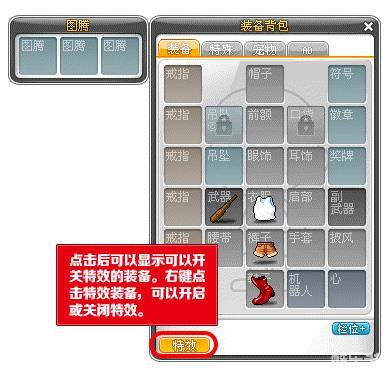 装备窗口显示了您当前角色所装备的各种道具,通过切换标签可以查看游戏装备、现金装备、宠物以及智能机器人等。双击道具可以脱下,有锁样图标的窗口表示目前无法使用该窗口,需要完成指定任务或使用指定道具开启。