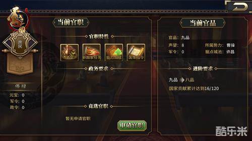 完成国家任务是主公大人们前期提升实力的主要途径。初始都从九品开始做起,通过任务和国战积累功名就可以提升官衔。中书令、丞相、镇国将军、大将军这些一人之下,万人之上的官职,等待着每一个付出过努力的人。