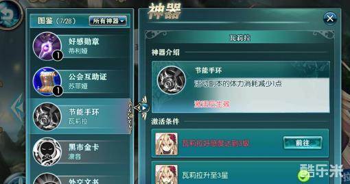 神无月手游角色瓦莉拉的个人神器是节能手环哦,听起就觉得是环保,节约资源的,这真的是神器嘛!!!功能就是活动副本的体力消耗减少1点,神器等级越高,减的体力就也越多,不过小编还是感觉太抠了,才减这么一点点,那瓦莉拉的神器要怎么解锁呢?