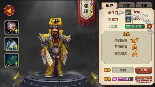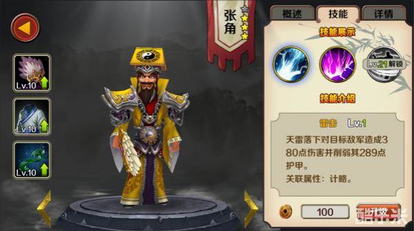作为辅助,能削弱敌军护甲、能眩晕武将,作为输出,既有范围伤害又有单体伤害,配合己方前排能够毫不费力的击溃对手。所以张角在前期是人手必备的一名紫色武将。