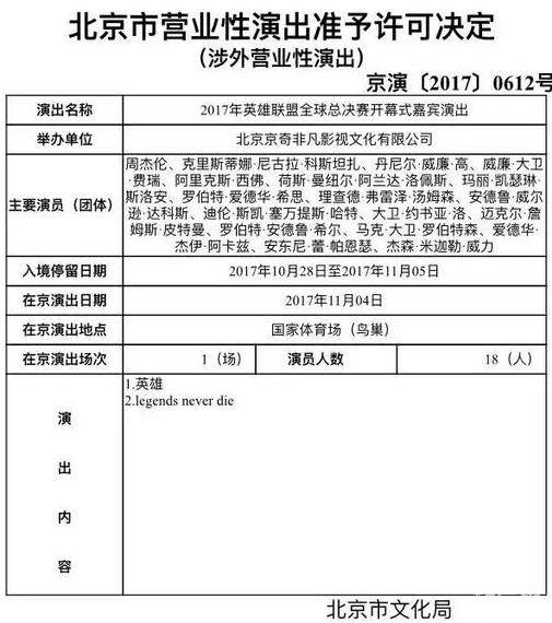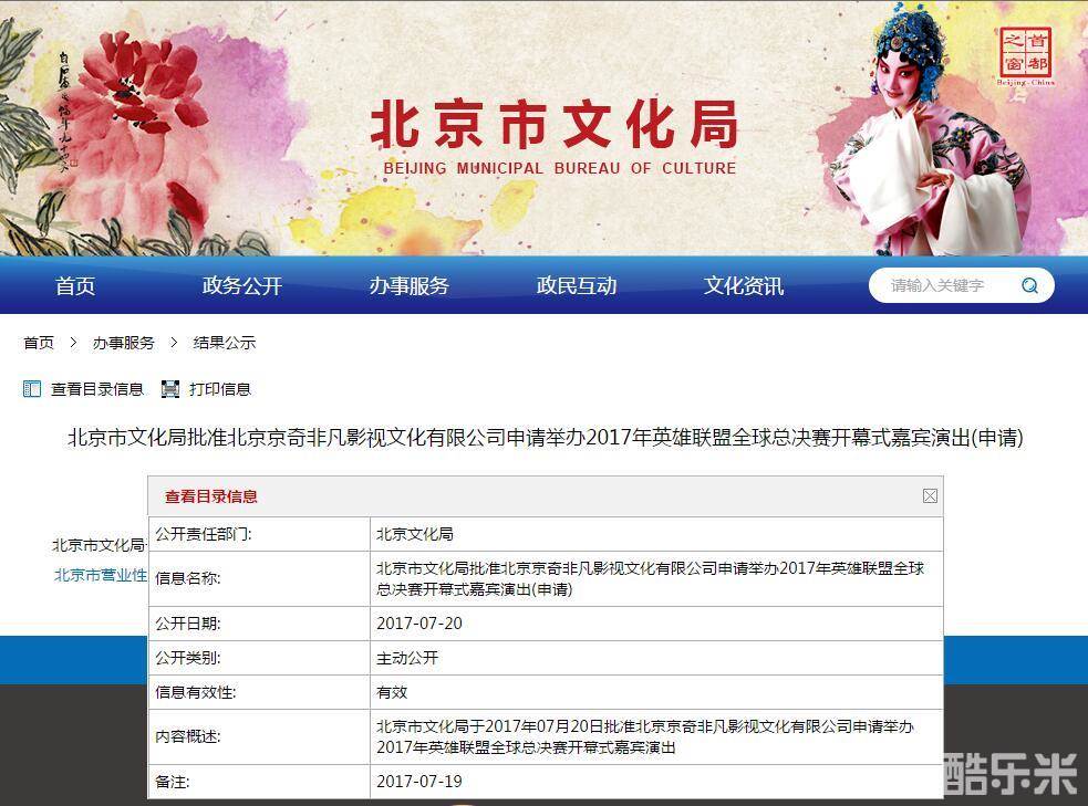 北京市文化局网站上出现一则批准消息,其内容为[北京市文化局批准北京京奇非凡影视文化有限公司申请举办2017年英雄联盟全球总决赛开幕式嘉宾演出(申请)]。