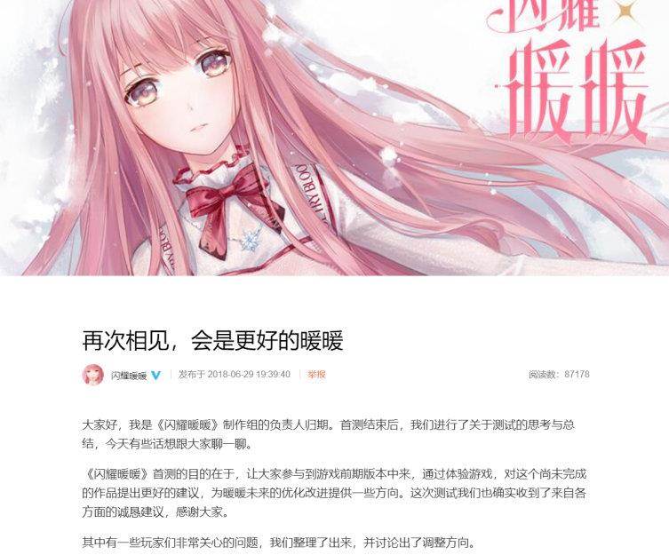 6月19日,叠纸公司旗下3D换装游戏《闪耀暖暖》开启首次内测,玩家对游戏体验反馈整体良好,游戏的3D技术、服装细节以及文案剧情等,让玩家赞不绝口。但同时也有部分玩家提出了各方面的优化意见。6月29日,在首测结束后的第三天,《闪耀暖暖》制作团队通过官方微博发布了关于产品首测的总结与反思,文中制作团队表示真诚听取了玩家的意见并承诺会调整优化方向。官方对玩家反馈的各项建议的重视态度,获大部分粉丝的认同与赞许。