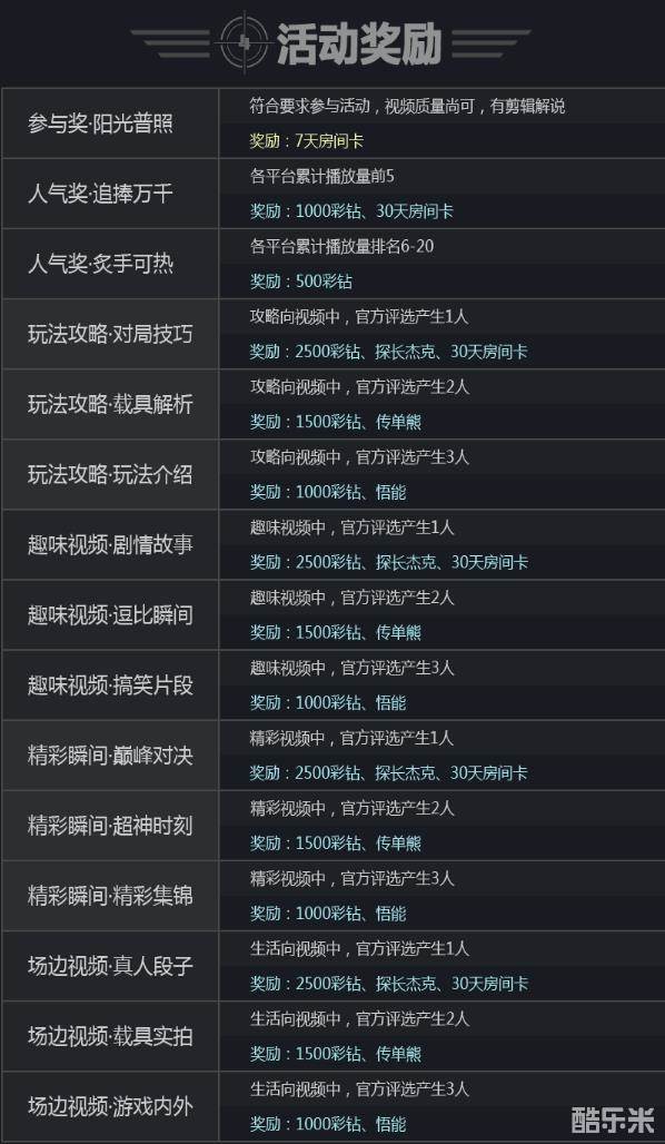 玩家们精心制作的视频,《终结者2:审判日》自然也将奉上诱人的奖励。此次活动中,凡按照参赛规则在平台上发布了视频,且视频质量优秀,有剪辑解说的,即可获得7天房间卡奖励。玩法攻略、趣味视频、精彩瞬间、场外视频四大主题的视频,将由官方根据细分主题各评选出6名获奖者,继续1000到2500不等的彩钻奖励和时装、30天房间卡等奖励。所有视频中,各平台累计播放量排名6至20的,均可获得500彩钻奖励,排名前五的,则可赢取1000彩钻和30天房间卡奖励!本次视频征集活动中,一名玩家最多可获得一次奖励,如有重复,只按最高奖励发放。